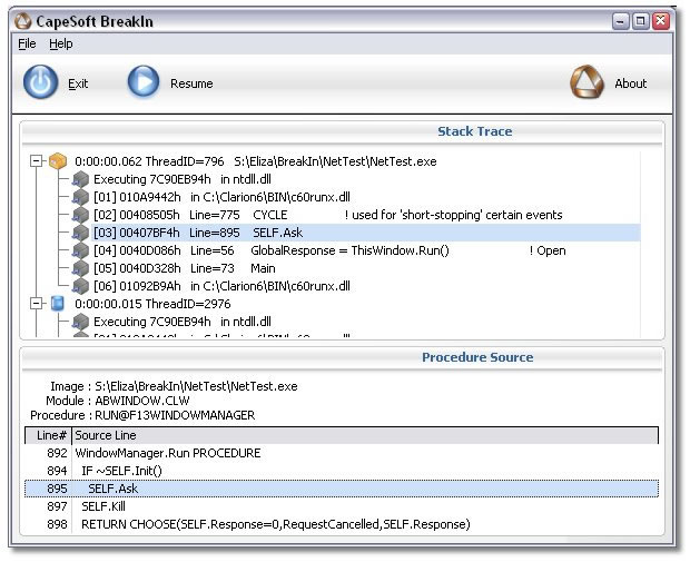 leaving you with no clue as to what might be causing your program to hang like that. CapeSoft BreakIn is designed to help you find out where your program is getting stuck quickly and easily.