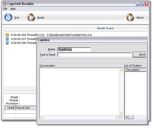 When you want to see what exactly your program is doing at a given point in time, press the break button, and the details appear on your BreakIn window!