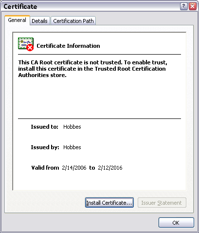 Tip: If you install the YourCA.Crt file into Internet Explorer (or any other browser) as a "Trusted Root Certification Authority" then IE will stop complaining that the certificate is issued by an untrusted source. Obviously this approach is not possible if you are creating a site for the world at large, but it is possible when creating intranet applications.