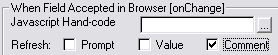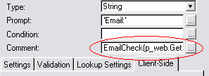 The NickName field shows how hand-coded validation can also be applied to the field. In this case the field has Validate Immediately setting on. In addition some source code has been added to the Server Code button on the Client-Side tab. The code contains both some validation (an arbitrary nickname length of 4 characters is enforced) and some "clean up" code which "corrects" the nickname to a suitable case.
