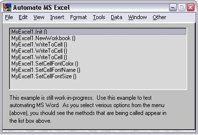 One of the big questions which we hear is "there are so many methods in Office Inside, how do I know what to look for?". The easiest way to get started is to compile the example application called "OffDemo.app". This example shows off most of what Office Inside is capable of doing, and contains "Automation Examples" for all the Microsoft Office programs which we currently support. Below is a picture of the Microsoft Excel automation example, showing the Clarion window called "Automate MS Excel", along with the instance of Microsoft Excel that the Clarion program started and is now automation ("controlling"). To make life easier for you, we have created a menu bar in each of the Clarion examples which matches the actual menu bar in the applicable Microsoft program. So if you want to know how to insert a picture into Word, you simply use the Clarion example application's "Automate MS Word" procedure, click on the "Insert" menu (in the Clarion example), and then click on "Insert Picture - From File". The actual method that is then called from code will appear in a list box on the Clarion window (as shown below for the Excel example), so that you can see exactly which method you need to use. You can then look up that method in the documentation to find out more about it, how it can be used, and what parameters etc can be used in it!