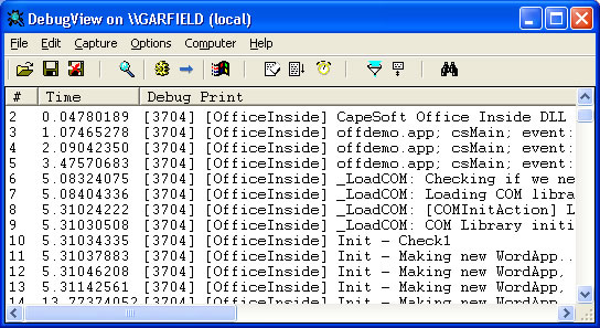 I'd recommend using debug output only when you're testing something. It can be quite annoying for other programmers to work on a system where there are a dozen different apps generating debug output at the same time! To make life easier, all Office Inside debug messages are prefixed with "[OfficeInside]", as shown below. You can set DebugView to ignore all messages that do not contain "[OfficeInside]". You will also take a very small performance hit when running an app with debugging turned on.