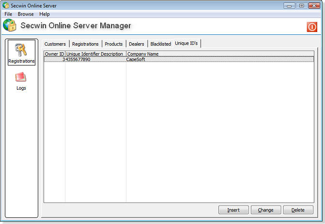 Unique ID's can be added to this browse. If the product in SOS is set that Unique ID's must be pre-registered, then SOS will check against this list if the Unique ID exists. If it is does, SOS will issue a registration. Otherwise it will return an Error, "Unique ID not found". Once the registration is issued, then SOS will update the company name against the Unique Identifier.