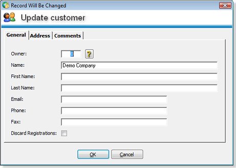 The customers database can be maintained by inserting, changing and removing customers. Please note that the customers must be added to this database before a product activation code can be created. The sort order by column in ascending or descending order can be selected by a left mouse click on the applicable column header. Selecting an update button calls the following update screen.