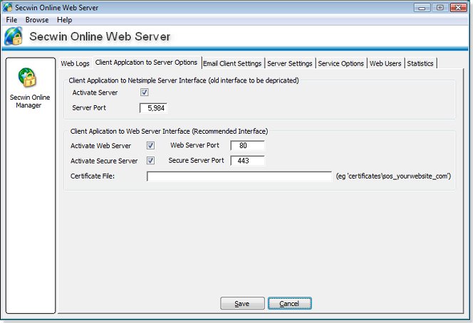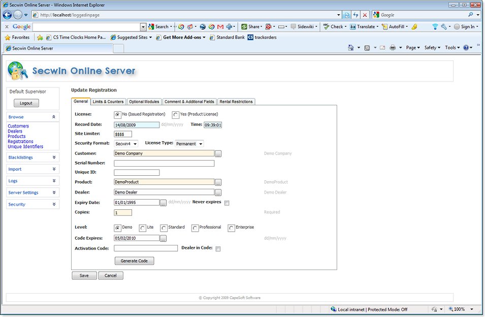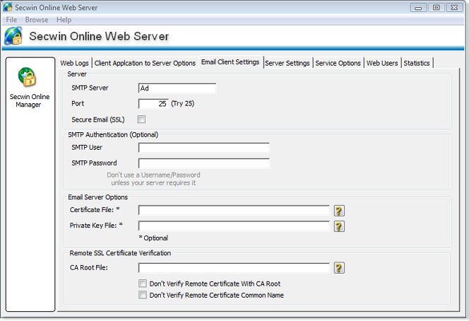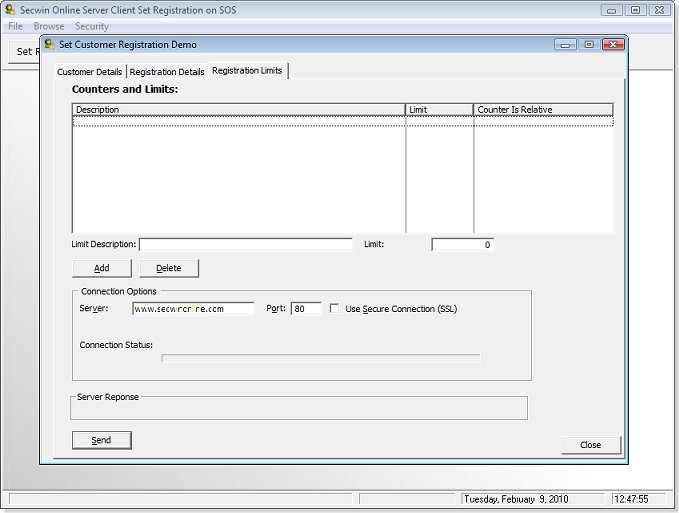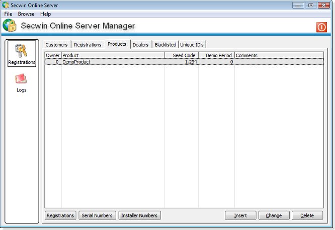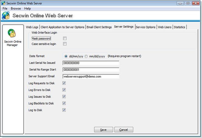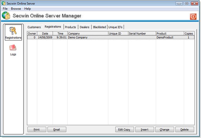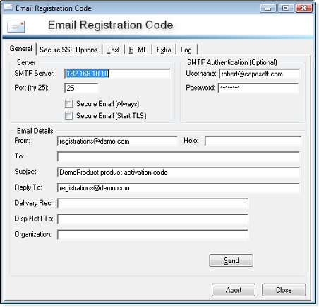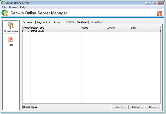 Note: Secwin Online Server features the ability to email activations codes to customers and dealers. To test this feature in the example shipped with SOS, please set the email server settings is in the registration server tab, to your SMTP server's settings.