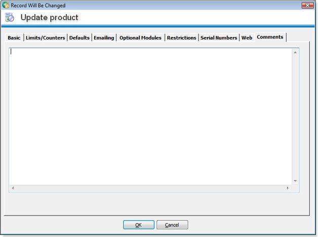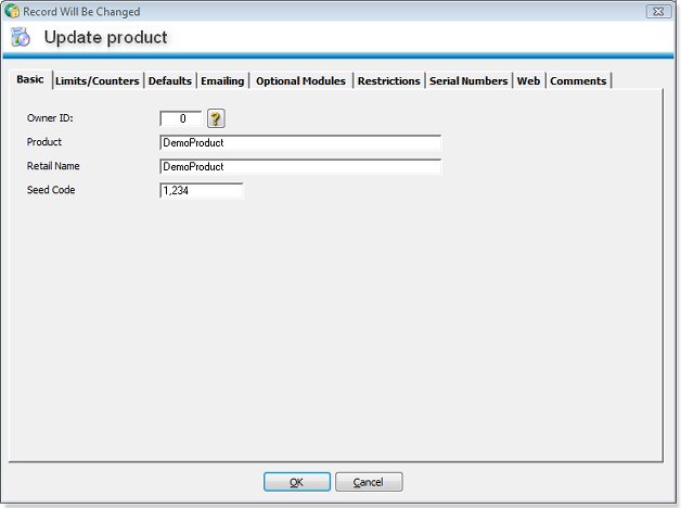 The optional modules entered here, will be available in the update registrations screen, once the product has been selected. This allows you to create a generic product i.e. Telephone Index with an additional module for example PINs. Press Ok to accept changes or cancel to go back to the products list.