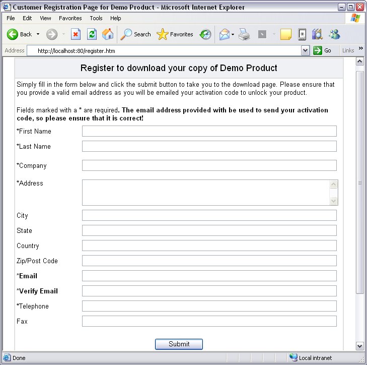 1. The client requires a hyperlink (CapeSoft's Hyperactive can do this for you) on the products registration page. This will open the registration web page as per the client example shipped with this install. Please customise the "register.htm" page to fit in with your product web site's look and feel.