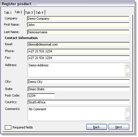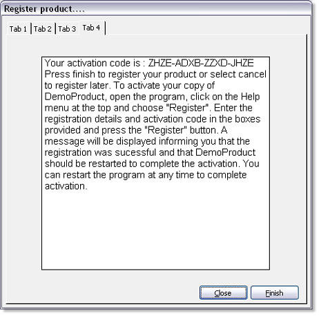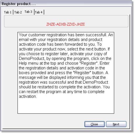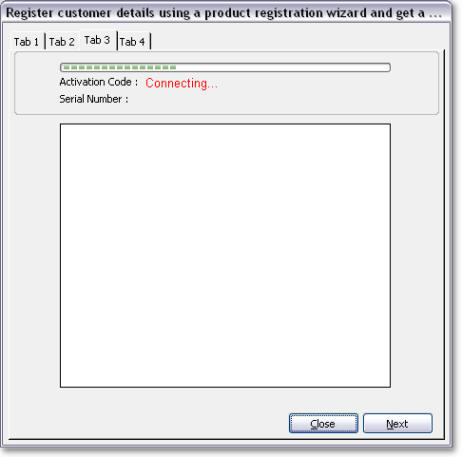 7. Tab4 of the wizard is for testing purposes. The next button will automatically get the activation code, so you can hide or customise the controls on this tab if required.