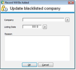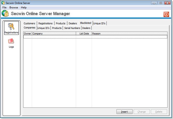 Companies, Unique ID's, products, serial numbers and dealers can and be blacklisted. As soon as a the blacklist date is reached, a product activation code will not be generated any more. The production activation code field will receive a message from the server "Code Denied". The blacklisted database can be maintained by inserting, changing and removing listings. The sort order by column in ascending or descending order can be selected by a left mouse click on the applicable column header. Selecting the relevant update button calls the following update screen.