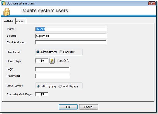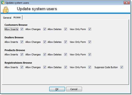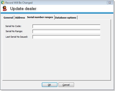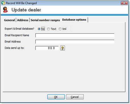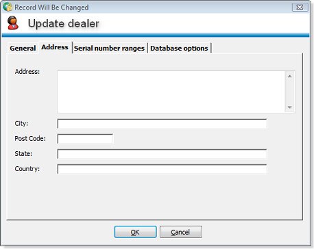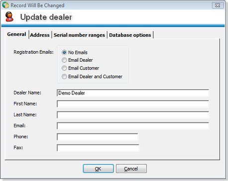 The dealers database can be maintained by inserting, changing and removing dealers. The sort order by column in ascending or descending order can be selected by a left mouse click on the applicable column header. Dealer information can be entered in the product activation codes and allows for product activation codes generated per dealer grouping. Selecting the relevant update button calls the following update screen.
