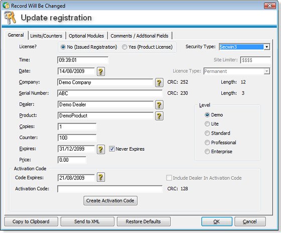 Enter the registration details for which the activation code must be generated. A expiry date of 31/12/2099 represents an permanent activation code. The modules become available when the product has been selected. This in turn is dependent of the modules how have filled in for the product. By selecting the GENERATE button, the activation code will be generated and details will be filled in for cutting & pasting, emailing or printing.