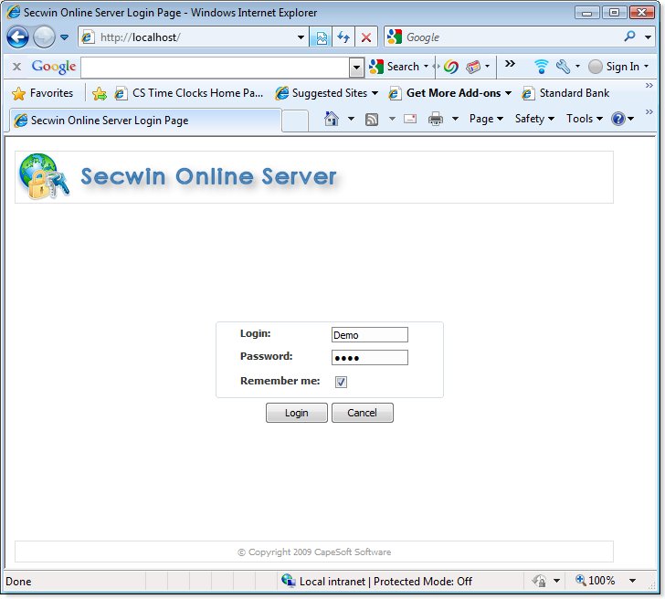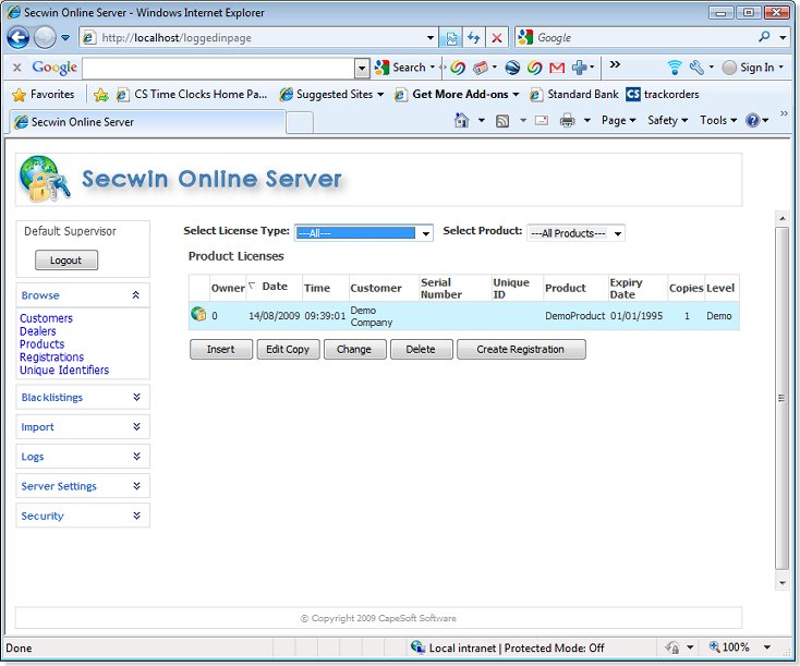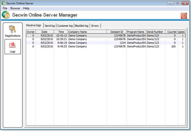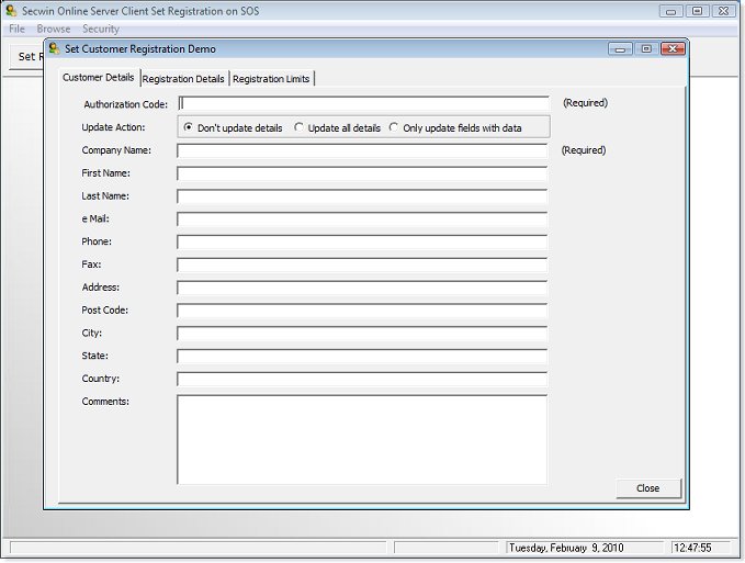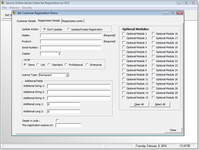 A Secwin Online Client Demo is shipped with this install and demonstrates the development options available to register an application through Secwin Online Server. The client demo illustrates the following options: