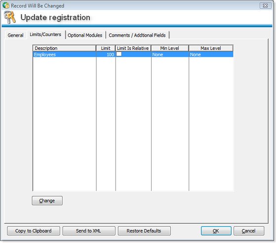 You can specify the table, the licence level range that the limit applies to. Levels below the limit will not allow any records, and licenses above the MaxLevel limit will not apply any limits to the table. The Default limit is the limit that is applied for a Default temporary initial activation license - as well as what is initially set in the manual registration screen.