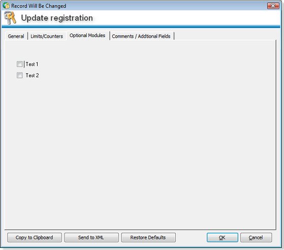On the Optional Modules tab, you may select the modules for the product registration you want to create. The modules are defined in your product.