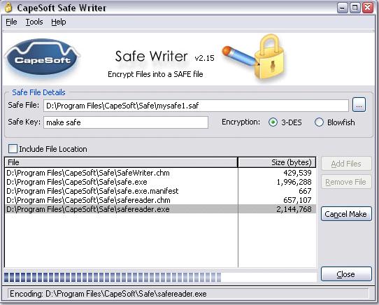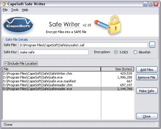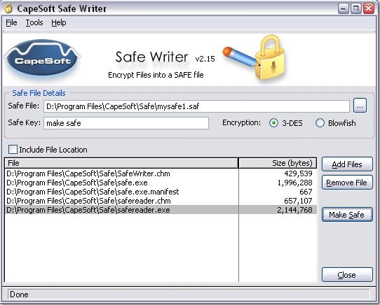 Safe Writer is used to encrypt files (using either the 168-bit Triple DES